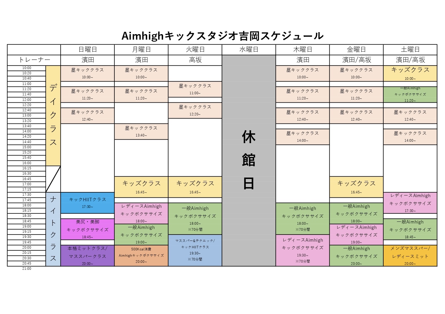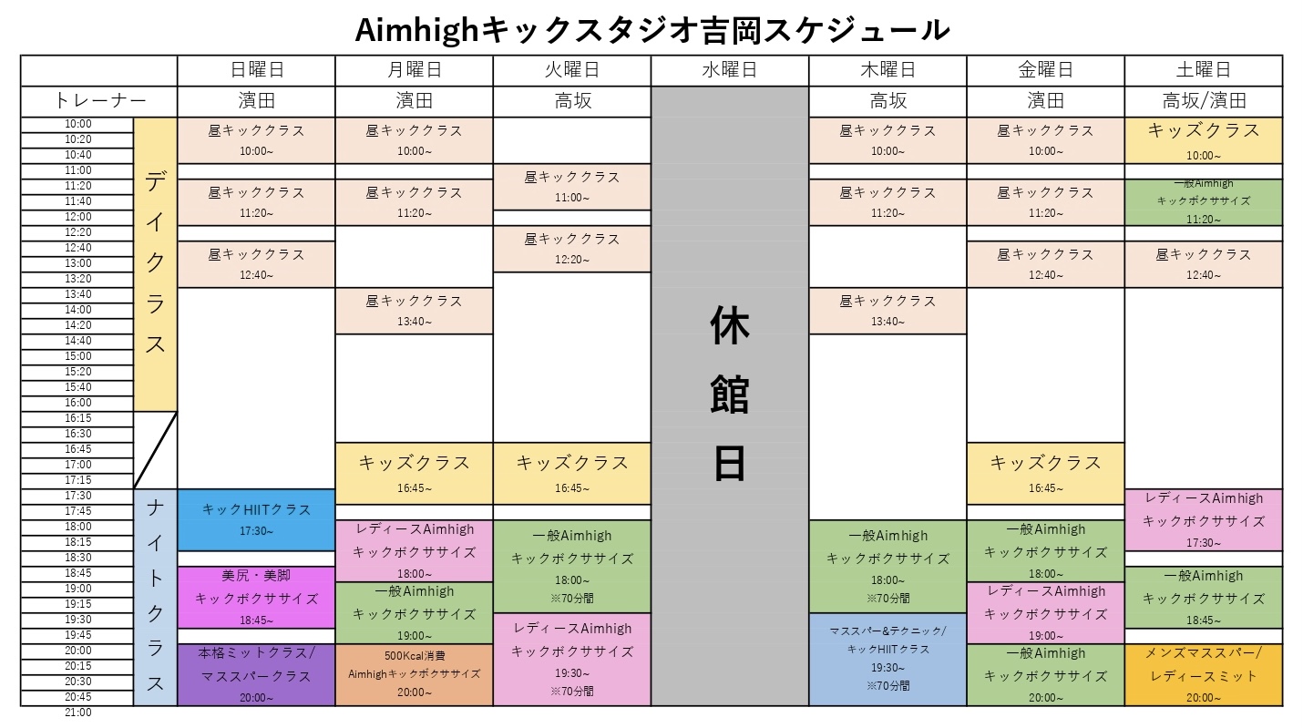クラススケジュール詳細は下記「Aimhigh kickstudio吉岡スケジュール」をご覧ください。