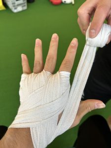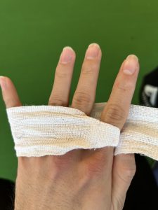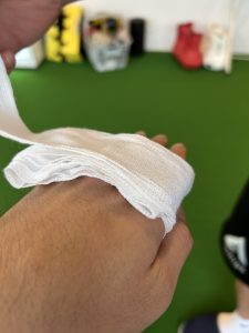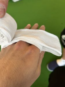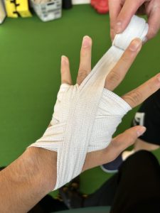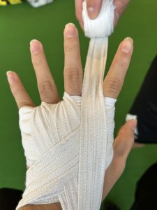 指を広げ、バンテージの長さにもよりますが、だいたい3〜5周ほど巻いてください